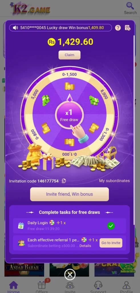 K2 Game is an online real money gaming app where users can play casino and skill based games to earn cash rewards.